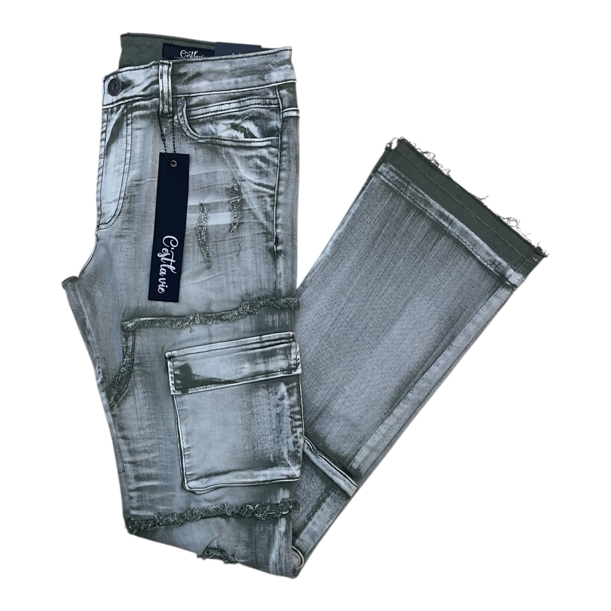 CV1013 - Olive Wash Stacked Flare Cargo Pocket Jeans
